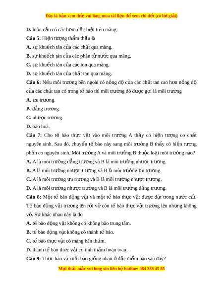 Câu 7: Cho tế bào th c ư v t ậ vào môi trư ng ơ A th y ấ co hi n ê tư ng ợ co ch t ấ nguyên sinh. Sau đo, chuy n