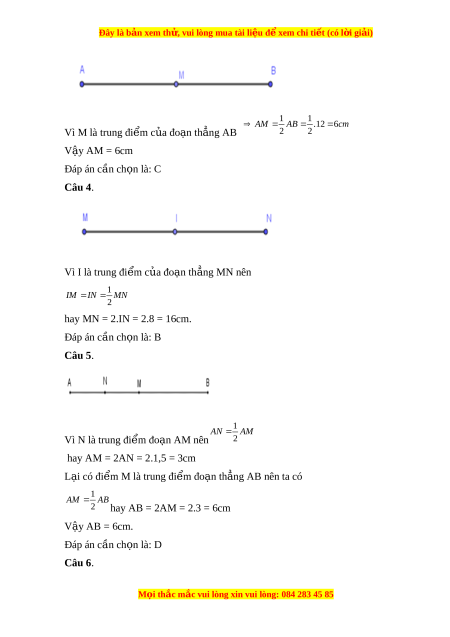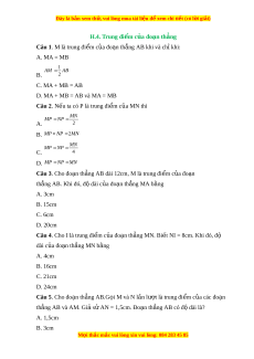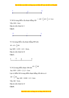 IM IN MN 2 hay MN = 2.IN = 2.8 = 16cm. Đáp án cần ch n ọ là: B Câu 5. 1 AN AM Vì N là trung đi m ể đo n ạ AM nên 2 hay AM = 2AN = 2.1,5 = 3cm L i ạ có đi m ể M là trung đi m ể đo n t ạ h ng ẳ AB nên ta có 1 AM AB 2 hay AB = 2AM = 2.3 = 6cm V y ậ AB = 6cm. Đáp án cần ch n ọ là: D Câu 6. M i