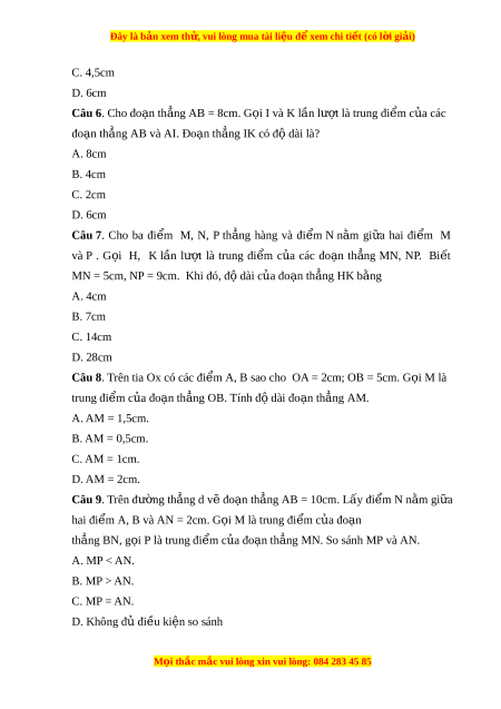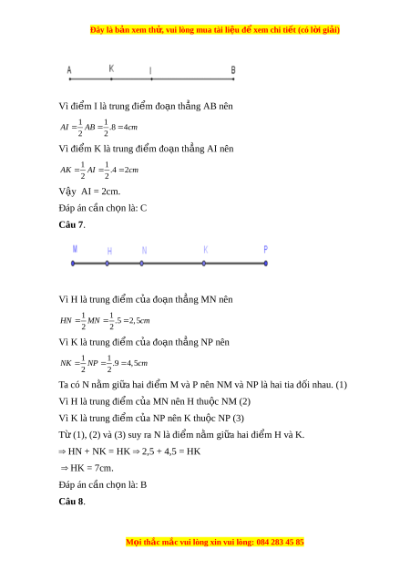 Đây là bản xem th , vu ử i lòng mua tài li u ệ đ xe ể m chi ti t ế (có l i ờ gi i ả ) C. 4,5cm D. 6cm Câu 6. Cho đo n ạ th ng ẳ AB = 8cm. G i ọ I và K lần lư t ợ là trung đi m ể c a ủ các đo n t ạ h ng ẳ AB và AI. Đo n t ạ h ng ẳ IK có độ dài là? A. 8cm B. 4cm C. 2cm D. 6cm Câu 7. Cho ba đi m ể M, N, P th ng ẳ hàng và đi m ể N n m ằ gi a ữ hai đi m ể M và P . G i ọ H, K lần lư t ợ là trung đi m ể c a ủ các đo n ạ th ng ẳ MN, NP. Bi t ế