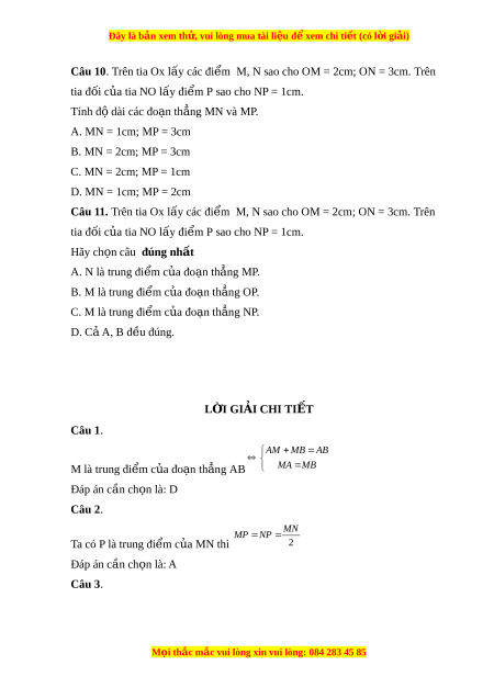 ể M, N sao cho OM = 2cm; ON = 3cm. Trên tia đối c a ủ tia NO lấy đi m ể P sao cho NP = 1cm. Hãy ch n câu ọ đúng nh t ấ A. N là trung đi m ể c a ủ đo n t ạ h ng ẳ MP. B. M là trung đi m ể c a ủ đo n t ạ h ng ẳ OP. C. M là trung đi m ể c a ủ đo n t ạ h ng ẳ NP. D. Cả A, B đ u ề đúng. L I Ờ GIẢI CHI TI T Ế Câu 1.