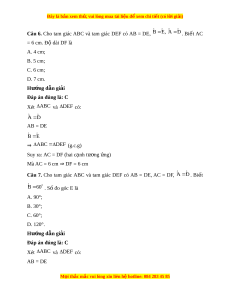 Câu 7. Cho tam giác ABC và tam giác DEF có AB = DE, AC = DF, A D . Bi t ế B 6 0 . Số đo góc E là A. 90°; B. 30°; C. 60°; D. 120°. Hư ng d ớ ẫn gi i ả Đáp án đúng là: C Xét A BC và D EF có: AB = DE M i