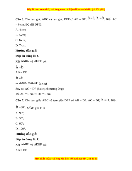 Câu 6. Cho tam giác ABC và tam giác DEF có AB = DE,