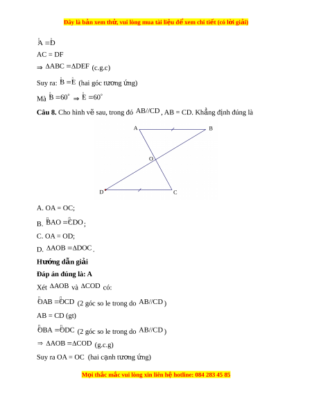 Câu 6. Cho tam giác ABC và tam giác DEF có AB = DE, B E , A D . Bi t ế AC = 6 cm. Độ dài DF là A. 4 cm; B. 5 cm; C. 6 cm; D. 7 cm. Hư ng d ớ ẫn gi i ả Đáp án đúng là: C Xét A BC và D EF có: A D AB = DE B E ⇒ A BC D EF (g.c.g) Suy ra: AC = DF (hai c nh ạ tư ng ơ ng) ứ Mà AC = 6 cm ⇒ DF = 6 cm