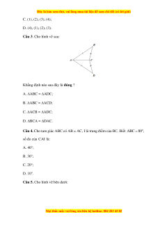 Câu 4. Cho tam giác ABC có AB = AC, I là trung điểm của BC. Biết ABC = 80 , số đo của CAI là: A. 40°; B. 30°; C. 20°; D. 10°.