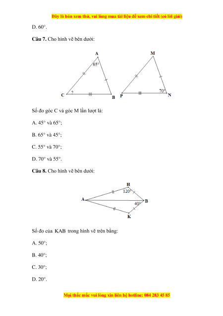 Số đo góc C và góc M lần lượt là: A. 45° và 65°; B. 65° và 45°; C. 55° và 70°; D. 70° và 55°.