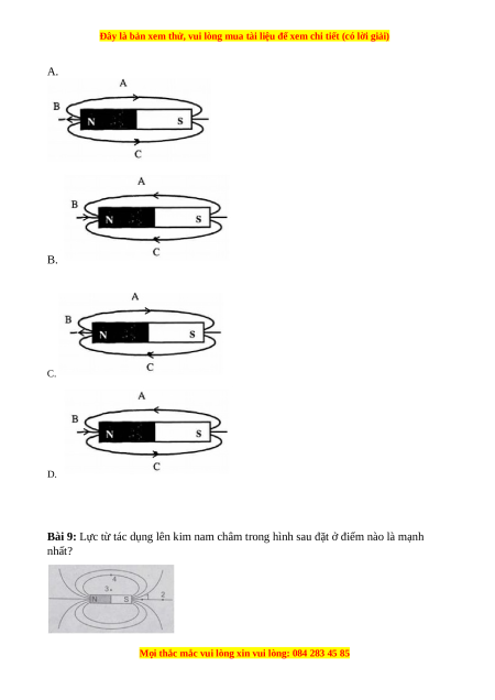 Bài 9: Lực từ tác dụng lên kim nam châm trong hình sau đặt ở điểm nào là mạnh