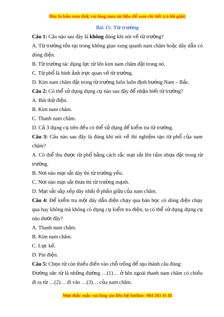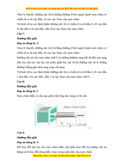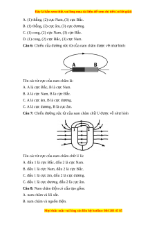 Đây là bản xem th , vu ử i lòng mua tài li u ệ đ xe ể m chi ti t ế (có l i ờ gi i ả ) A. (1) th ng, ( ẳ 2) c c N ự am, (3) c c ự B c ắ . B. (1) th ng, ẳ (2) c c âm ự , (3) c c d ự ư ng ơ . C. (1) cong, (2) c c N ự am, (3) c c B ự c ắ . D. (1) cong, (2) c c ự B c, ắ (3) c c ự Nam. Câu 6: Chi u ề c a đ ủ ư ng ờ s c ứ t c ừ a nam ủ châm được v nh ẽ hì ư nh: Tên các t c ừ c ự c a nam ủ châm là: A. A là c c B ự c, B ắ là c c N ự am. B. A là c c N ự am, B là c c ự B c ắ . C. A là c c âm ự , B là c c ự dư ng ơ . C. A là c c d ự ư ng, ơ B là c c ự âm. Câu 7: Chi u ề đư ng s ờ ức t c ừ a ủ nam châm ch U ữ đư c ợ v nh ẽ hì ư nh Tên các t c ừ c ự c a nam ủ châm chữ U là: A. đầu 1 là c c B ự c, đ ắ ầu 2 là c c ự Nam. B. đầu 1 là c c ự Nam, đ u 2 l ầ à c c B ự c ắ . C. đầu 1 là c c ự âm, đầu 2 là c c d ự ư ng ơ . C. đầu 1 là c c ự dư ng, đ ơ ầu 2 là c c âm ự .