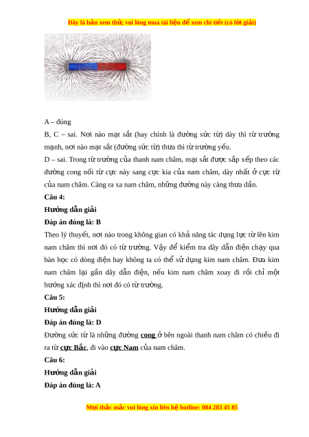 Đây là bản xem th , vu ử i lòng mua tài li u ệ đ xe ể m chi ti t ế (có l i ờ gi i ả ) A – đúng B, C – sai. N i ơ nào m t ạ s t ắ (hay chính là đư ng ờ s c ứ t ) ừ dày thì từ trư ng ờ m nh, n ạ i ơ nào m t ạ s t ắ (đư ng ờ s c ứ t ) ừ th a ư thì t t ừ rư ng y ờ u. ế D – sai. Trong từ trư ng ờ c a ủ thanh nam châm, m t ạ s t ắ đư c ợ s p ắ x p ế theo các đư ng ờ cong n i ố từ c c ự này sang c c ự kia c a ủ nam châm, dày nh t ấ ở c c ự từ c a nam ủ
