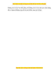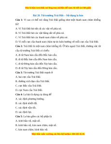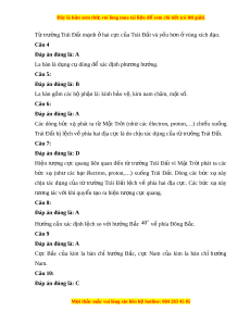 ạ êlectron, proton,…) xu ng ố Trái Đ t ấ . Dòng các b c ứ xạ này chịu tác d ng ụ c a ủ từ trư ng ờ Trái Đ t ấ l ch ệ về phía hai đ a ị c c. ự Các b c ứ xạ này tư ng t ơ ác v i ớ khí quy n ể t o r ạ a hi n t ệ ư ng c ợ c quang. ự Câu 8: Đáp án đúng là: A Hư ng c ớ ần xác đ nh l ị ch s ệ o v i ớ hư ng B ớ c ắ 0 40 v phí ề a Đông B c. ắ Câu 9 Đáp án đúng là: A C c ự B c ắ c a ủ kim la bàn chỉ hư ng ớ B c, ắ c c ự Nam c a ủ kim la bàn chỉ hư ng ớ Nam. Câu 10: Đáp án đúng là: C M i