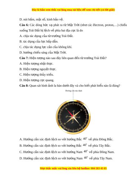 Đây là bản xem th , vu ử i lòng mua tài li u ệ đ xe ể m chi ti t (c ế ó l i ờ gi i ả ) T t ừ rư ng ờ Trái Đ t ấ m nh ạ ở hai c c c ự a ủ Trái Đ t ấ và y u h ế n ơ vùng xí ở ch đ o. ạ Câu 4 Đáp án đúng là: A La bàn là d ng c ụ dùng đ ụ xác ể đ nh ph ị ư ng ơ hư ng. ớ Câu 5: Đáp án đúng là: B La bàn gồm các b ph ộ n l ậ à: kính b o ả v , ki ệ m nam châm, m t ặ s . ố Câu 6: Đáp án đúng là: A Các dòng b c ứ xạ phát ra từ M t ặ Tr i