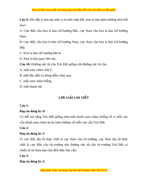 Đây là bản xem th , vu ử i lòng mua tài li u ệ đ xe ể m chi ti t (c ế ó l i ờ gi i ả ) Câu 9: Khi đ t ặ la bàn t i ạ m t ộ vị trí trên m t ặ đ t ấ , kim la bàn đ nh ị hư ng ớ nh ư thế nào? A. Cực B c ắ c a ủ kim la bàn chỉ hư ng ớ B c, ắ c c ự Nam c a ủ kim la bàn ch ỉhư ng ớ Nam. B. C c ự B c ắ c a ủ kim la bàn chỉ hư ng ớ Nam, c c ự Nam c a ủ kim la bàn ch ỉhư ng ớ B c. ắ C. Kim la bàn ch h ỉ ư ng ớ b t ấ kì. D. Kim la bàn quay liên t c. ụ Câu 10: Đư ng ờ s c ứ t c ừ a ủ Trái Đ t ấ gi ng v ố i ớ đư ng ờ s c ứ t c ừ a ủ A. m t ộ nam châm chữ U. B. m t