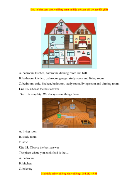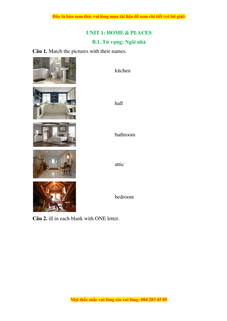 Câu 1. Match the pictures with their names. kitchen hall bathroom attic bedroom