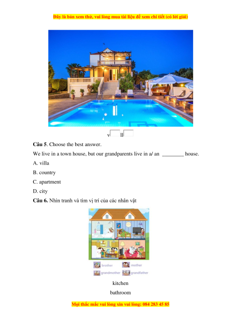We live in a town house, but our grandparents live in a/ an ________ house. A. villa B. country C. apartment D. city