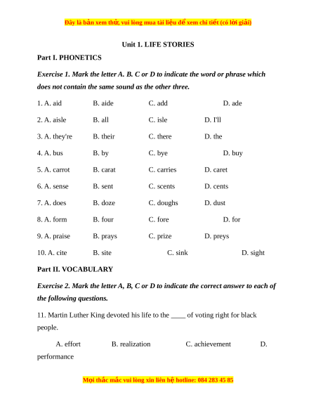 Đây là bản xem th , vu ử i lòng mua tài li u ệ đ xe ể m chi ti t ế (có l i ờ gi i ả ) Unit 1. LIFE STORIES Part I. PHONETICS
