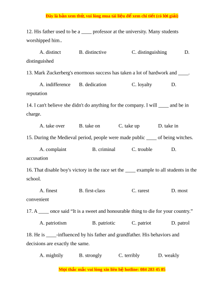 12. His father used to be a ____ professor at the university. Many students worshipped him.. A. distinct B. distinctive C. distinguishing D. distinguished