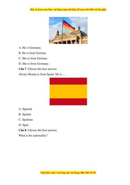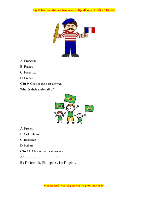 Câu 9. Choose the best answer. What is their nationality? A. French B. Colombian C. Brazilian D. Italian
