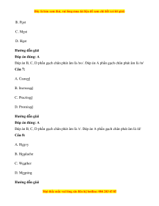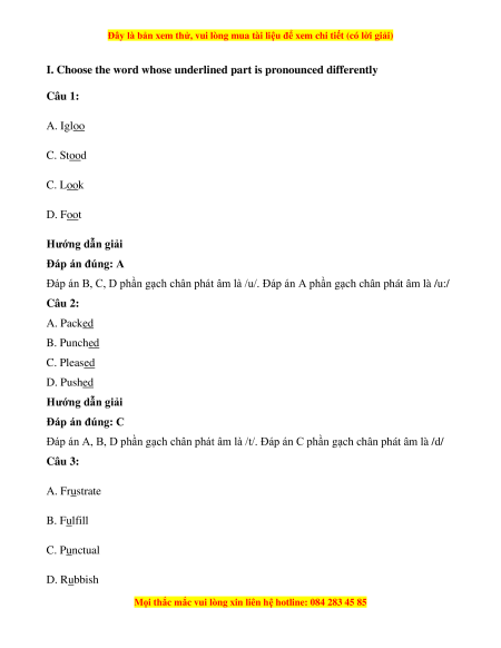 Đáp án A, B, D phần gạch chân phát âm là /t/. Đáp án C phần gạch chân phát âm là /d/ Câu 3: A. Frustrate B. Fulfill C. Punctual D. Rubbish