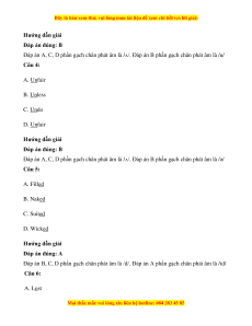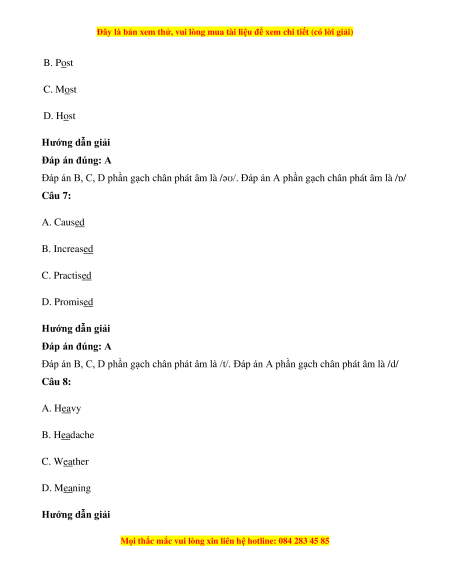Đáp án B, C, D phần gạch chân phát âm là /t/. Đáp án A phần gạch chân phát âm là /d/ Câu 8: A. Heavy B. Headache C. Weather D. Meaning Hướng dẫn giải