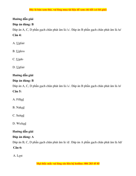 Đáp án A, C, D phần gạch chân phát âm là /ʌ/. Đáp án B phần gạch chân phát âm là /u/ Câu 4: A. Unfair B. Unless C. Undo D. Unfair Hướng dẫn giải Đáp án đúng: B