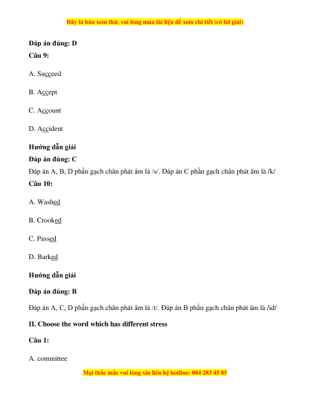 Đáp án đúng: D Câu 9: A. Succeed B. Accept C. Account D. Accident Hướng dẫn giải Đáp án đúng: C