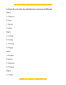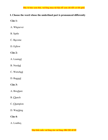 I. Choose the word whose the underlined part is pronounced differently Câu 1: A. Whenever B. Settle C. Become D. Fellow Câu 2: A. Learned B. Needed C. Wretched D. Ragged Câu 3: A. Brochure B. Church C. Champion D. Watching Câu 4: A. Loathes