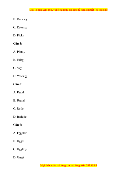 B. Decides C. Returns D. Picks Câu 5: A. Plenty B. Fairy C. Sky D. Weekly Câu 6: A. Rural B. Brutal C. Rude D. Include Câu 7: A. Feather B. Head C. Healthy D. Great