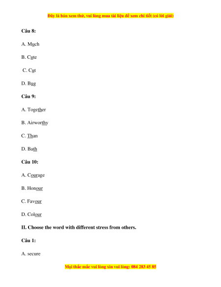 Câu 8: A. Much B. Cute C. Cut D. Bug Câu 9: A. Together B. Airworthy C. Than D. Bath Câu 10: A. Courage B. Honour C. Favour D. Colour
