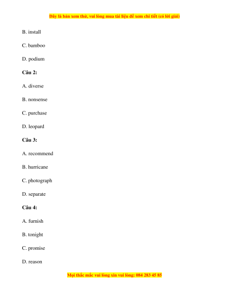 B. install C. bamboo D. podium Câu 2: A. diverse B. nonsense C. purchase D. leopard Câu 3: A. recommend B. hurricane C. photograph D. separate Câu 4: A. furnish B. tonight C. promise D. reason