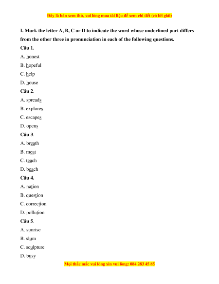 from the other three in pronunciation in each of the following questions. Câu 1. A. honest B. hopeful C. help D. house Câu 2. A. spreads B. explores C. escapes D. opens Câu 3. A. breath B. meat C. teach D. beach Câu 4. A. nation B. question C. correction D. pollution Câu 5. A. sunrise B. slum C. sculpture D. busy