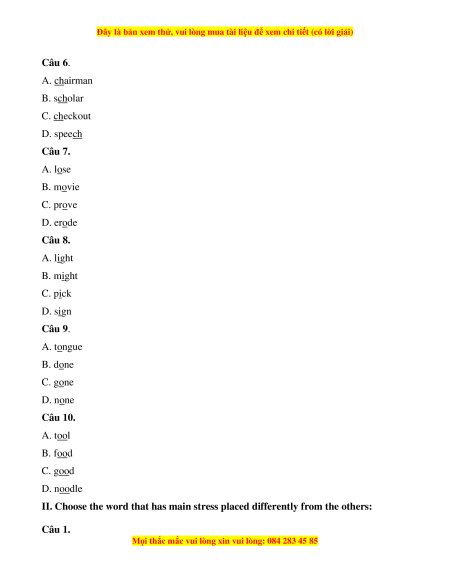 Câu 6. A. chairman B. scholar C. checkout D. speech Câu 7. A. lose B. movie C. prove D. erode Câu 8. A. light B. might C. pick D. sign Câu 9. A. tongue B. done C. gone D. none Câu 10. A. tool B. food C. good D. noodle