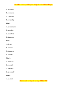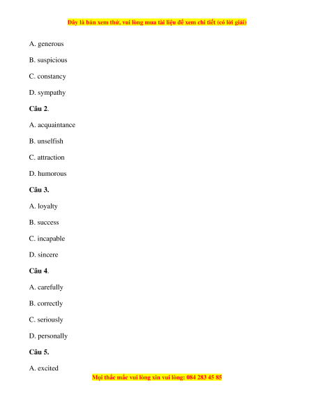 A. generous B. suspicious C. constancy D. sympathy Câu 2. A. acquaintance B. unselfish C. attraction D. humorous Câu 3. A. loyalty B. success C. incapable D. sincere Câu 4. A. carefully B. correctly C. seriously D. personally Câu 5. A. excited