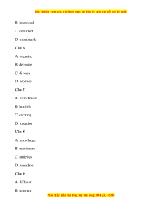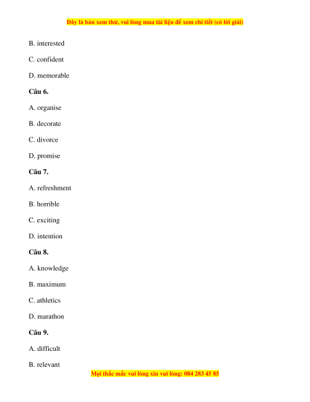 B. interested C. confident D. memorable Câu 6. A. organise B. decorate C. divorce D. promise Câu 7. A. refreshment B. horrible C. exciting D. intention Câu 8. A. knowledge B. maximum C. athletics D. marathon Câu 9. A. difficult B. relevant