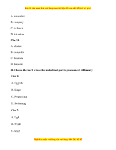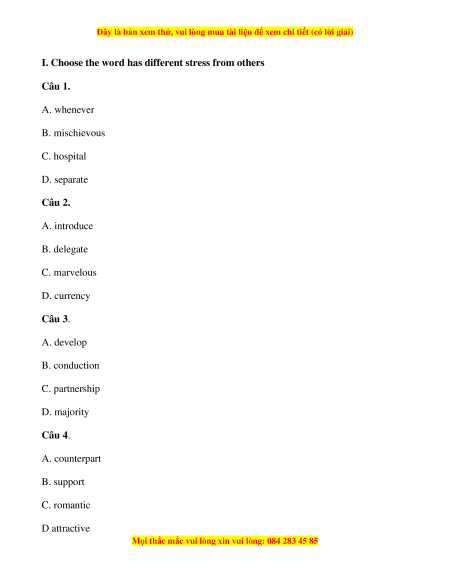 I. Choose the word has different stress from others Câu 1. A. whenever B. mischievous C. hospital D. separate Câu 2. A. introduce B. delegate C. marvelous D. currency Câu 3. A. develop B. conduction C. partnership D. majority Câu 4. A. counterpart B. support C. romantic D attractive