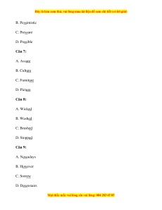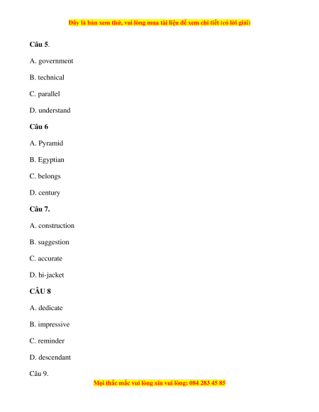 Câu 5. A. government B. technical C. parallel D. understand Câu 6 A. Pyramid B. Egyptian C. belongs D. century Câu 7. A. construction B. suggestion C. accurate D. hi-jacket CÂU 8 A. dedicate B. impressive C. reminder D. descendant Câu 9.