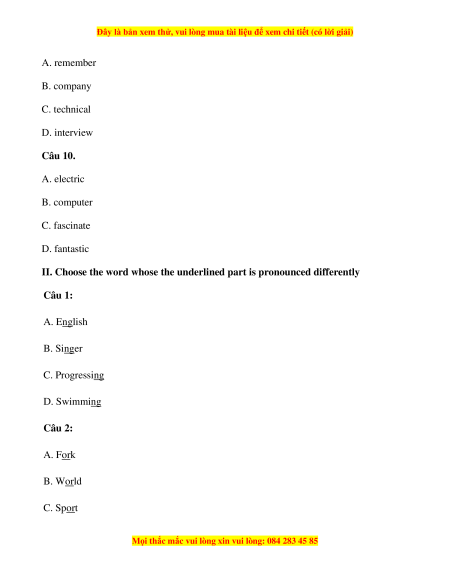 II. Choose the word whose the underlined part is pronounced differently Câu 1: A. English B. Singer C. Progressing D. Swimming Câu 2: A. Fork B. World C. Sport