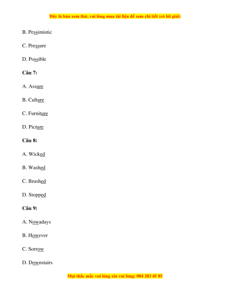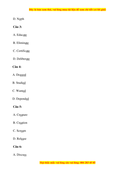 D. North Câu 3: A. Educate B. Eliminate C. Certificate D. Deliberate Câu 4: A. Dogged B. Studied C. Wanted D. Depended Câu 5: A. Creature B. Creation C. Scream D. Release Câu 6: A. Discuss