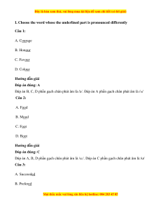 I. Choose the word whose the underlined part is pronounced differently Câu 1: A. Courage B. Honour C. Favour D. Colour Hướng dẫn giải Đáp án đúng: A