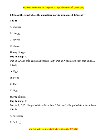 Đáp án A, B, D phần gạch chân phát âm là /u:/. Đáp án C phần gạch chân phát âm là /u/ Câu 3: A. Succeeded B. Prefered