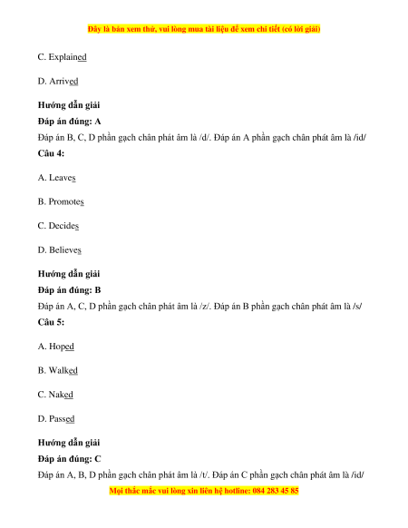 Đáp án B, C, D phần gạch chân phát âm là /d/. Đáp án A phần gạch chân phát âm là /id/ Câu 4: A. Leaves B. Promotes C. Decides D. Believes Hướng dẫn giải Đáp án đúng: B