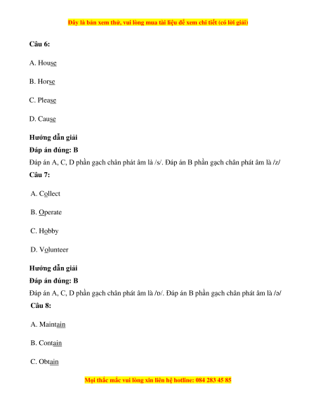 Đáp án A, C, D phần gạch chân phát âm là /s/. Đáp án B phần gạch chân phát âm là /z/ Câu 7: A. Collect B. Operate C. Hobby D. Volunteer Hướng dẫn giải Đáp án đúng: B
