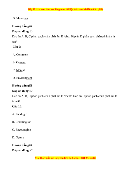 Đáp án A, B, C phần gạch chân phát âm là /ment/. Đáp án D phần gạch chân phát âm là /mənt/ Câu 10: A. Facilitate B. Combination C. Encouraging D. Nature Hướng dẫn giải Đáp án đúng: C