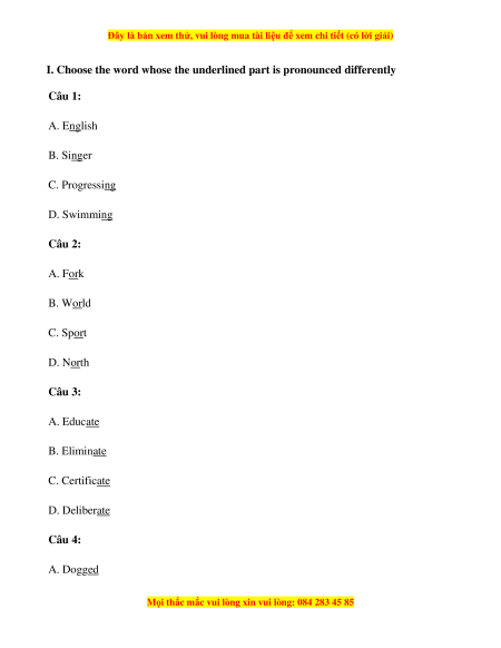 I. Choose the word whose the underlined part is pronounced differently Câu 1: A. English B. Singer C. Progressing D. Swimming Câu 2: A. Fork B. World C. Sport D. North Câu 3: A. Educate B. Eliminate C. Certificate D. Deliberate Câu 4: A. Dogged