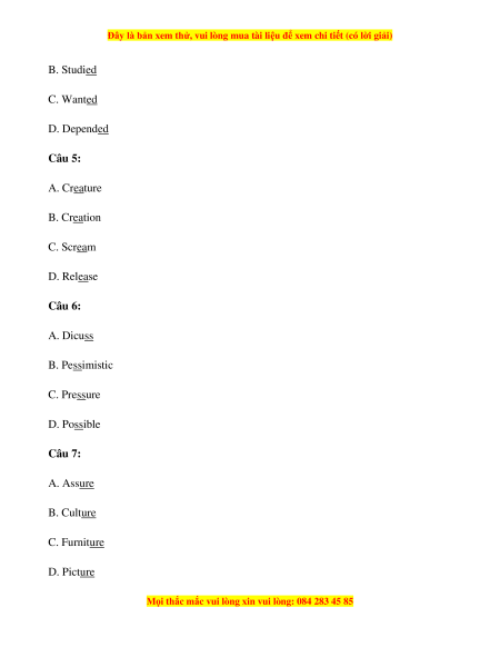 B. Studied C. Wanted D. Depended Câu 5: A. Creature B. Creation C. Scream D. Release Câu 6: A. Dicuss B. Pessimistic C. Pressure D. Possible Câu 7: A. Assure B. Culture C. Furniture D. Picture