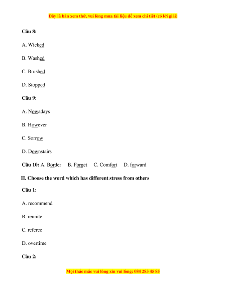 II. Choose the word which has different stress from others Câu 1: A. recommend B. reunite C. referee D. overtime Câu 2:
