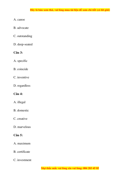 A. canoe B. advocate C. outstanding D. deep-seated Câu 3: A. specific B. coincide C. inventive D. regardless Câu 4: A. illegal B. domestic C. creative D. marvelous Câu 5: A. maximum B. certificate C. investment