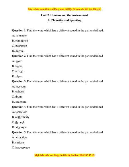 Question 1. Find the word which has a different sound in the part underlined. A. volunteer B. committee C. guarantee D. degree