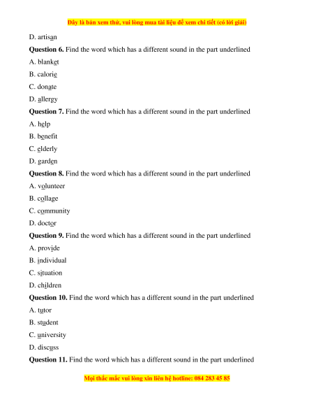 Question 6. Find the word which has a different sound in the part underlined A. blanket B. calorie C. donate D. allergy