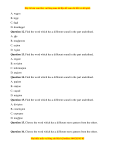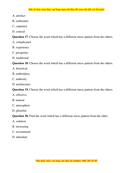 Question 20. Find the word which has a different stress pattern from the other. A. solution B. increasing C. recommend D. abundant