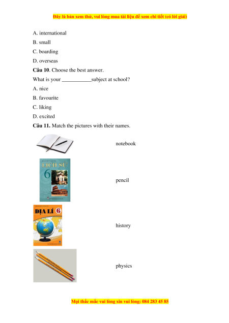 Câu 11. Match the pictures with their names. notebook pencil history physics