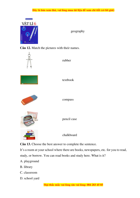 Câu 12. Match the pictures with their names. rubber textbook compass pencil case chalkboard